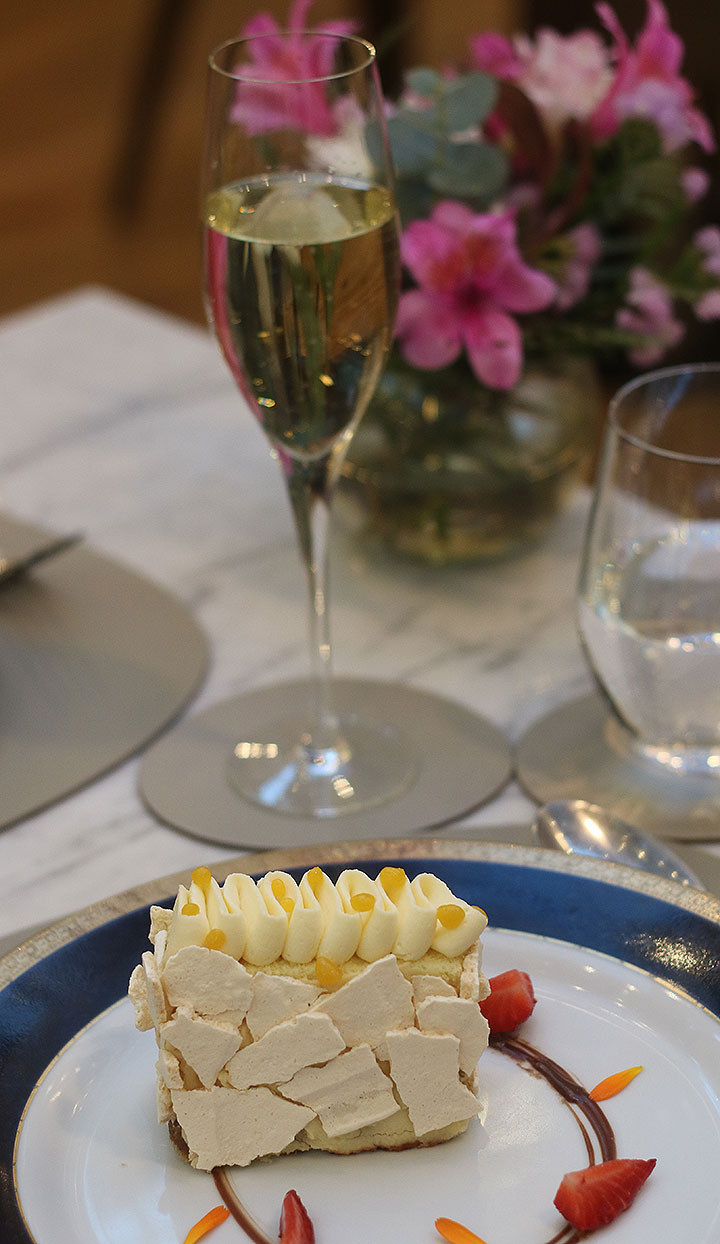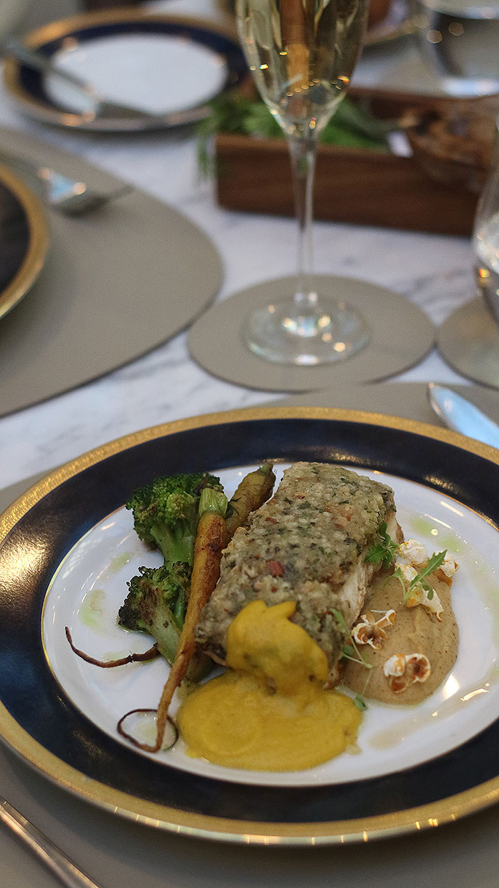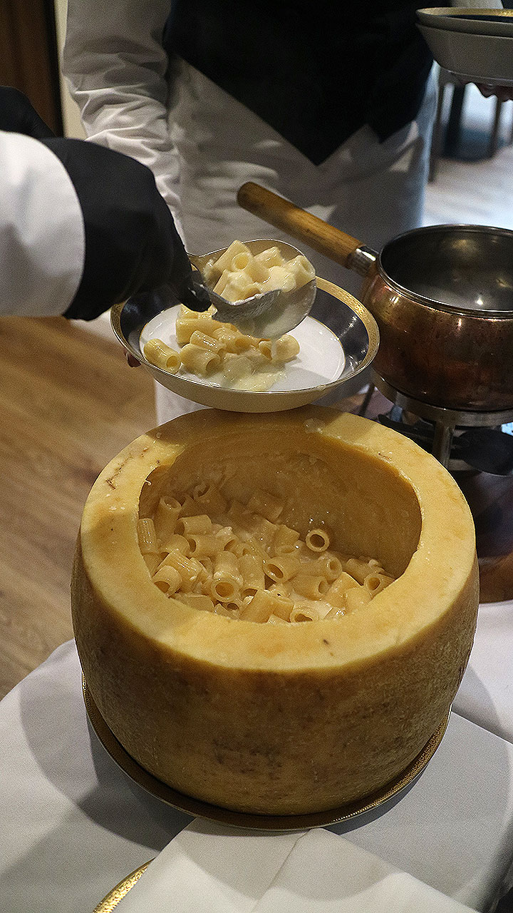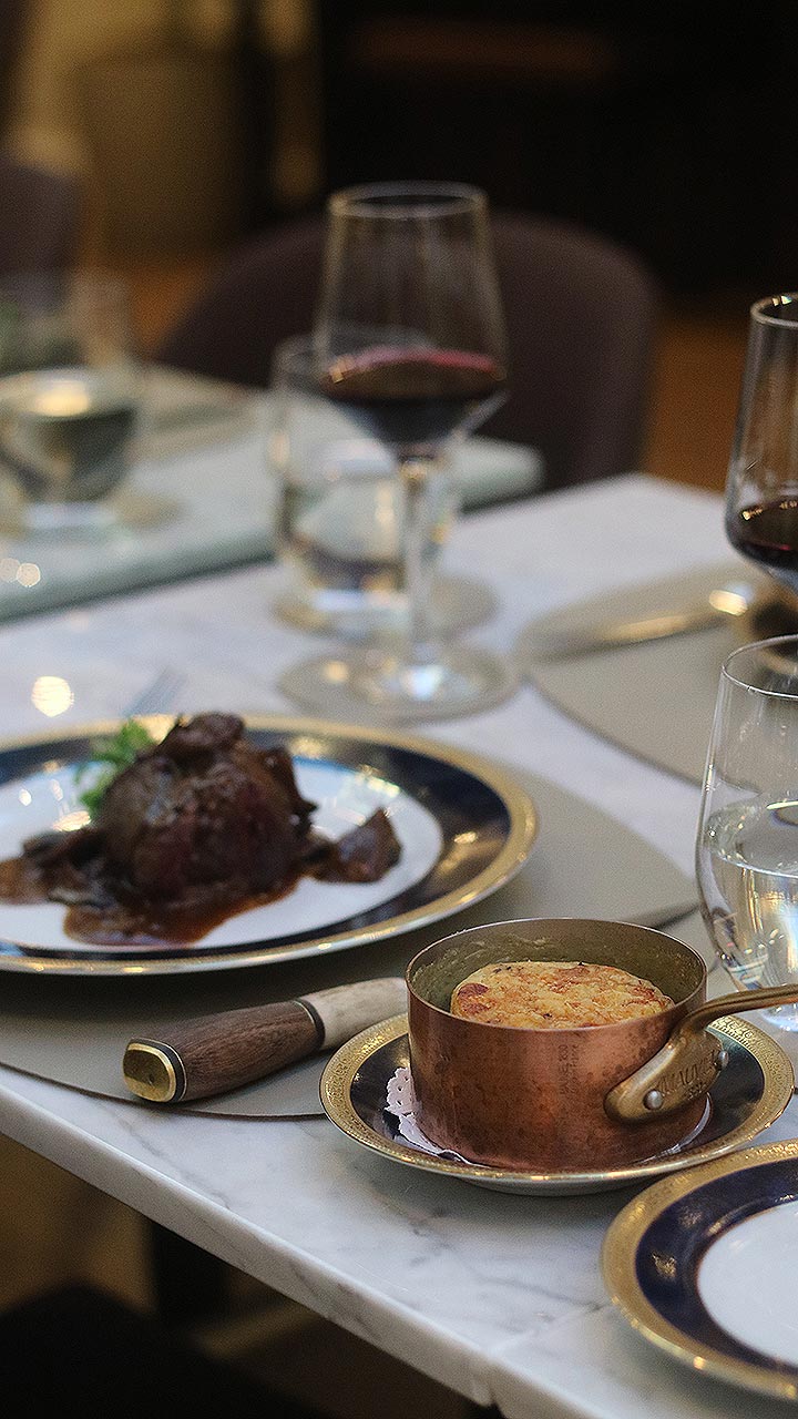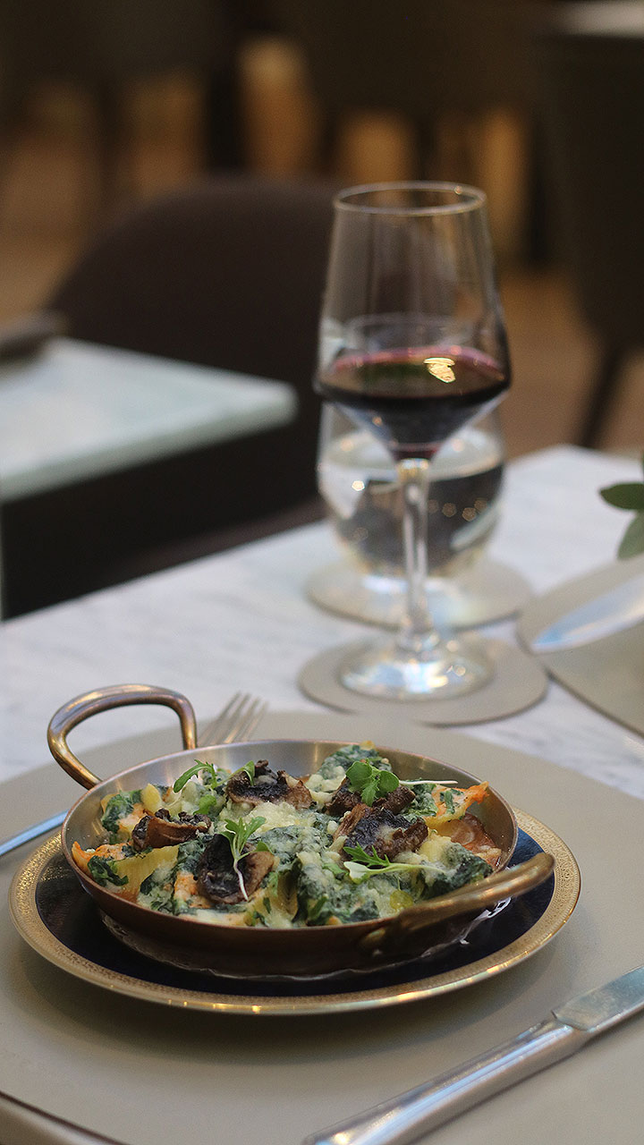El restaurante es un deleite para los sentidos con su cocina abierta y fogones de leña, donde carnes, pescados y verduras se preparan frente al comensal. La propuesta gastronómica combina tradición europea con técnicas modernas, utilizando productos frescos y de primera calidad. Entre los platos que reflejan técnica y dedicación, meticulosamente preparados por el chef Alejandro Dobronich. destacan: el Lomo Wellington, los Spaghetti Cacio e Pepe, elaborados con Pecorino Romano premiado en la Copa del Mundo de Queso 2024, el espectacular Tiramisú al gueridón, finalizado con savoiardis y crema de mascarpone frente al cliente.